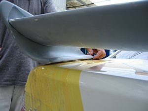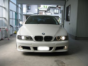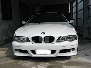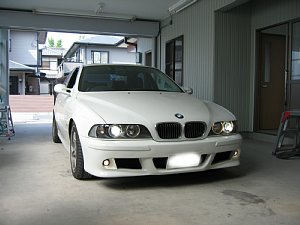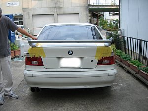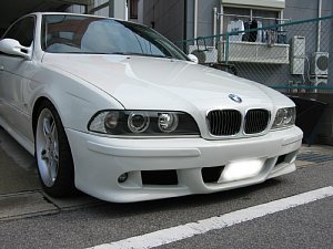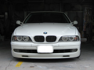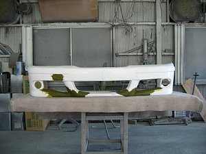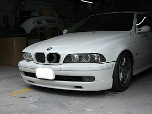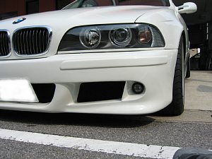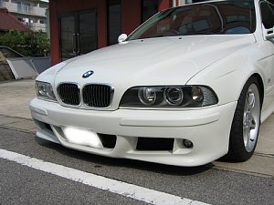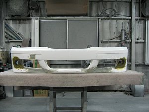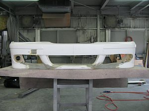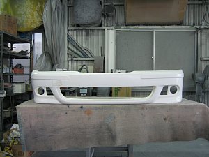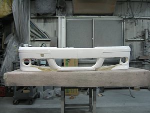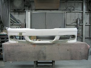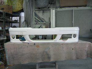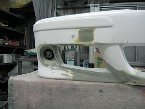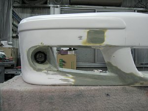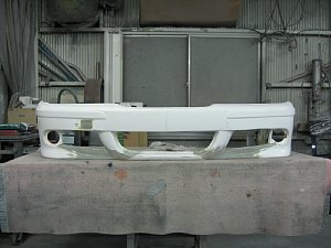 BMW社外エアロ。 センターのダクトが広すぎるので、加工して狭くします。 現行BMWのフォグを移植するため、 フォグ穴も加工します。 |